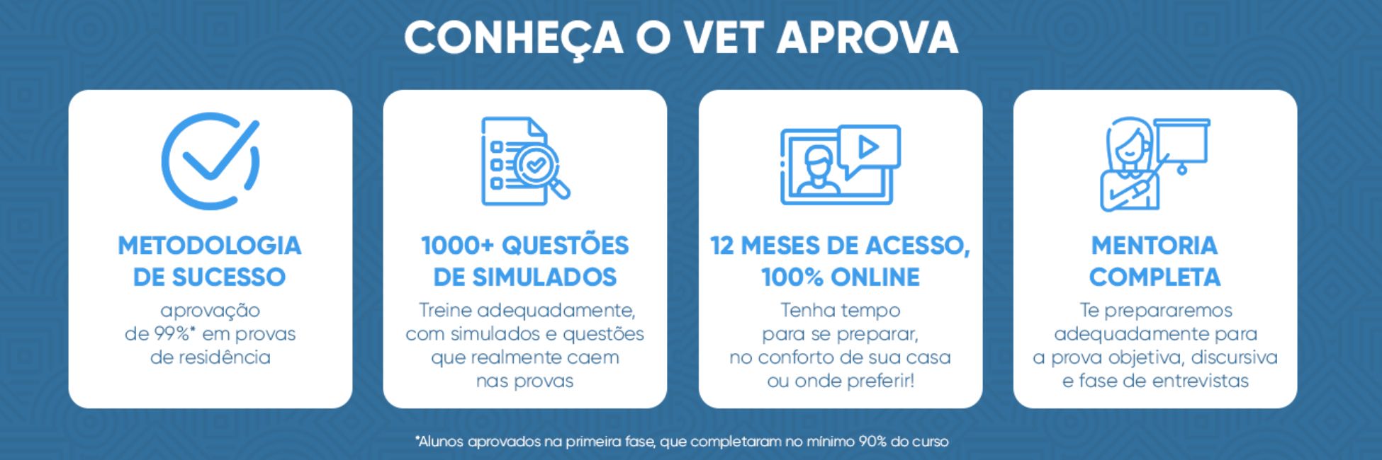 Inovadora no mercado e ÚNICA a focar 100% no processo seletivo de Residência veterinária, o Vet Aprova conta com uma metodologia validada, conteúdo robusto e atualizado, questões de provas anteriores, material escrito por professores especialistas e suporte para os nossos alunos na plataforma. Além disso, constante atualizações baseados nos editais de diversas instituições, e adição de conteúdo contínuo, para que nossos alunos não percam nenhum detalhe sobre o processo seletivo!